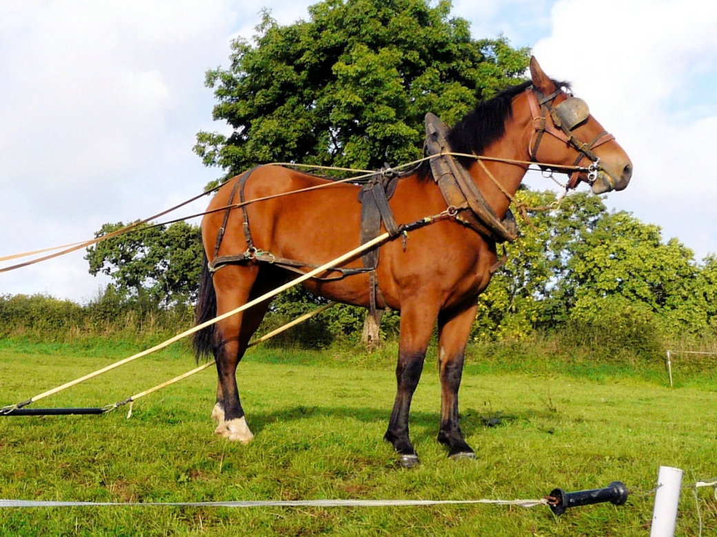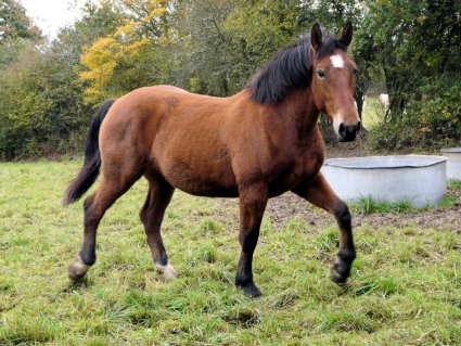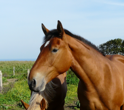 Son hennissement enjoué lorsque je viens la voir témoigne de sa joie de me voir également. Bien sûr, je ne viens pas les "mains vides" : carottes, pain et pommes sont appréciées. Uta vit à l'extérieur, l'été dans le pré, l'hiver aux "Mielles" ,accompagnée de sa soeur, jolie aussi, mais pour laquelle j' éprouve moins d'affection. Ces robustes, mais non moins élégants chevaux, supportent sans trop de problème le climat de la région : pluie et vent souvent et s'abritent tant bien que mal sous des abris naturels que forment les arbres. Le cob normand est une race qui gagne à être connue. Ce ne sont pas des chevaux de selle proprement dit, mais ils peuvent être montés et surtout attelés aisément.