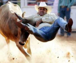 Ce sport que l'on appelait autrefois le " bulldogging " ou combat de taureaux, exige que le cow-boy saute de son cheval sur le dos d'un taureau de 450 kg avant de l'attraper par ses cornes, de l'immobiliser par terre. Si les membres et la tête du taureau se trouvent dans la même direction, le combat est terminé. Le cow-boy est assisté par un " hazer " (assistant à cheval qui court du côté droit du taureau pour le maintenir en ligne droite).