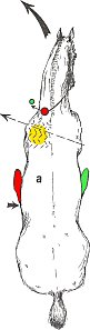Main droite active (gros rond rouge). Se porte à gauche légèrement plus haute que la main gauche. Elle pousse donc l’épaule du cheval vers la porte à gauche. Notez que dans le schéma d’Etienne Saurel (Pratique de l’équitation d’après les maîtres français), la main droite passe la ligne de l’encolure… alors qu’on entend régulièrement qu’il ne faut pas.