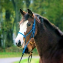 Licol Ethologique en corde 6mm polyester à 16 fuseaux, avec noeud fiador sous l‘auge et noeuds en croix sur la muserolle.