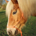 Licol éthologique en corde 6mm polyester à 24 fuseaux avec nœud fiador sous l‘auge et nœuds en croix sur la muserolle.