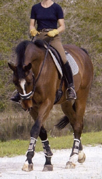 Le Pas Allongé: Le cheval couvre plus de terrain dans le même rythme, bien régulier. Le cheval étend un peu son encolure et avance la tête. Le contact du cavalier doit suivre.