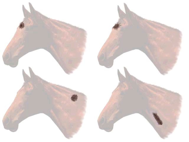 La description de la position des épis qui sont sur la tête se fait par rapport à différentes lignes virtuelles : salières, arcades, ligne supérieure des yeux, moyenne des yeux, inférieure des yeux.