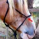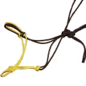 La différence de ce licol réside dans le fait qu‘il ne possède aucun noeud sur la muserolle. L‘action sur le chanfrein est donc plus douce puisque les points de pression des noeuds habituels n‘existent plus.