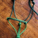 Licol éthologique en corde 6mm polyester à 24 fuseaux avec nœud fiador sous l‘auge et nœuds en croix sur la muserolle.