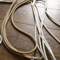 Elles sont fabriquées en 2 parties: une partie avant en corde de 6mm de diamètre pour un passage facil et un coulissemnt idéal dans les anneaux d‘un surfaix. La partie rênes, en 8 mm est plus lourde mais sans être encombrante pour une tenue en main adéquate.