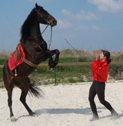 Il faut environ 1ans pour qu’un cheval fasse entièrement confiance à son maitre. Loin de se décourager, la jeune cavalière a redoublé de patience pour effectuer un débourrage dans les règles de l’art. « J’ai débuté la désensibilisation en le brossant puis en en lui apprenant à donner les pieds pour entretenir ses sabots. En même temps, j’ai commencé le travail de longe pour lui apprendre les allures avant de monter d’abord avec une deuxième personne pour le tenir, puis seule. Il a eu un petit coup de speed la 1ere fois que j’ai fait le sac a patate, puis c’est passé ».Peu de temps avant sa rencontre avec Polux, Mathilde avait vu un spectacle équestre au centre de Mosnet qu’elle a fréquenté durant 8 ans. De la lui est venue l’envie de se produire devant un public. Avec Polux, elle a donc débuté une formation pour connaitre d’impressionnantes figures. De la simple révérence aux figures de hautes écoles comme la croupade ou la cabriole, en passant par la jambette, ou la mise a genou. Polux apprend vite. Un avantage mais aussi une responsabilité pour sa cavalière qui doit faire attention car « certaines figures sont des postures de défenses a l’état naturel et il faut aussi apprendre au cheval à ne pas les faire n’importe où et n’importe quand ! »