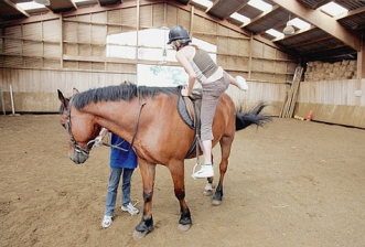L'étape suivante consiste à monter sur le cheval, seul ou avec l'aide de quelqu'un. Au départ, il est conseillé de demander à quelqu'un de tenir le cheval pour éviter qu'il bouge.