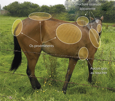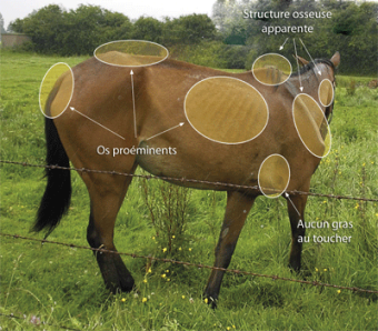 Si l'animal semble perdre du poids, il faut contrôler sa ration et lui donner plus de nourriture (sous forme d'aliments concentrés). Il est conseillé de lui administrer un vermifuge différent du précédent étant donné que les vers parasites développent une résistance à certains médicaments. Si aucune amélioration n'est constatée dans les deux semaines, il est recommandé d'appeler un vétérinaire. Celui-ci examinera la dentition de l'animal et lui administrera un traitement. Il peut aussi procéder à des prélèvements. Des examens sanguins peuvent révéler des troubles hépatiques ou digestifs, des troubles de surmenage, d'anémie ou une autre infection bactérienne ou virale légère dont les symptômes varient. La détérioration physique cache souvent une maladie chronique. Si la nourriture et un traitement vermifuge supplémentaire n'améliorent pas l'état de santé du cheval, il faut le faire examiner au plus vite. En attendant trop longtemps pour détecter et pour traiter une maladie chronique, le cheval risque d'avoir des problèmes de santé et d'endurance à vie.