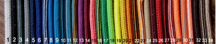 Licol éthologique en corde 6mm polyester à 24 fuseaux avec nœud fiador sous l‘auge et nœuds en croix sur la muserolle.