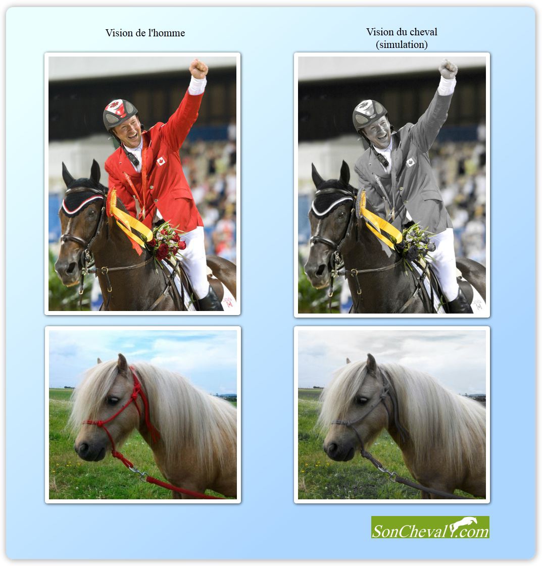 La vision des couleurs est assez limitée chez le cheval: il peut distinguer le jaune et bleu du gris mais difficilement le orange et le rouge.